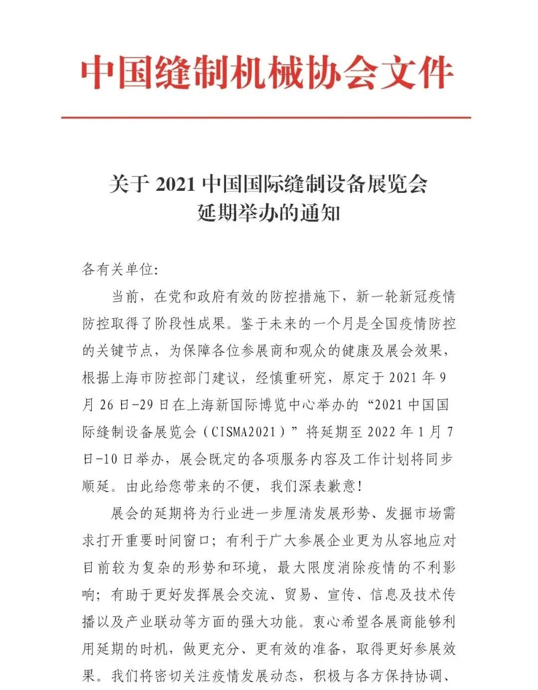 接主辦方通知,原定于2021年9月26-29日舉辦的“2021中國國際縫制設備展覽會(CISMA2021)”開展時間延期至2022年1月7-10日舉辦。