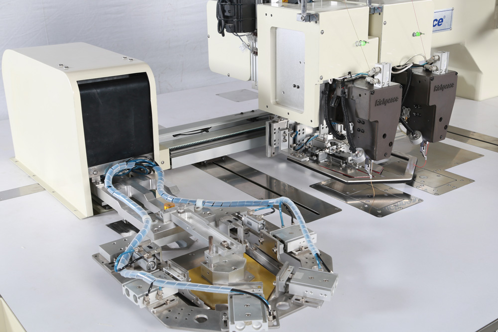 增加兩套獨立機頭裝置,實現了雙色縫紉的全自動雙色自動折邊